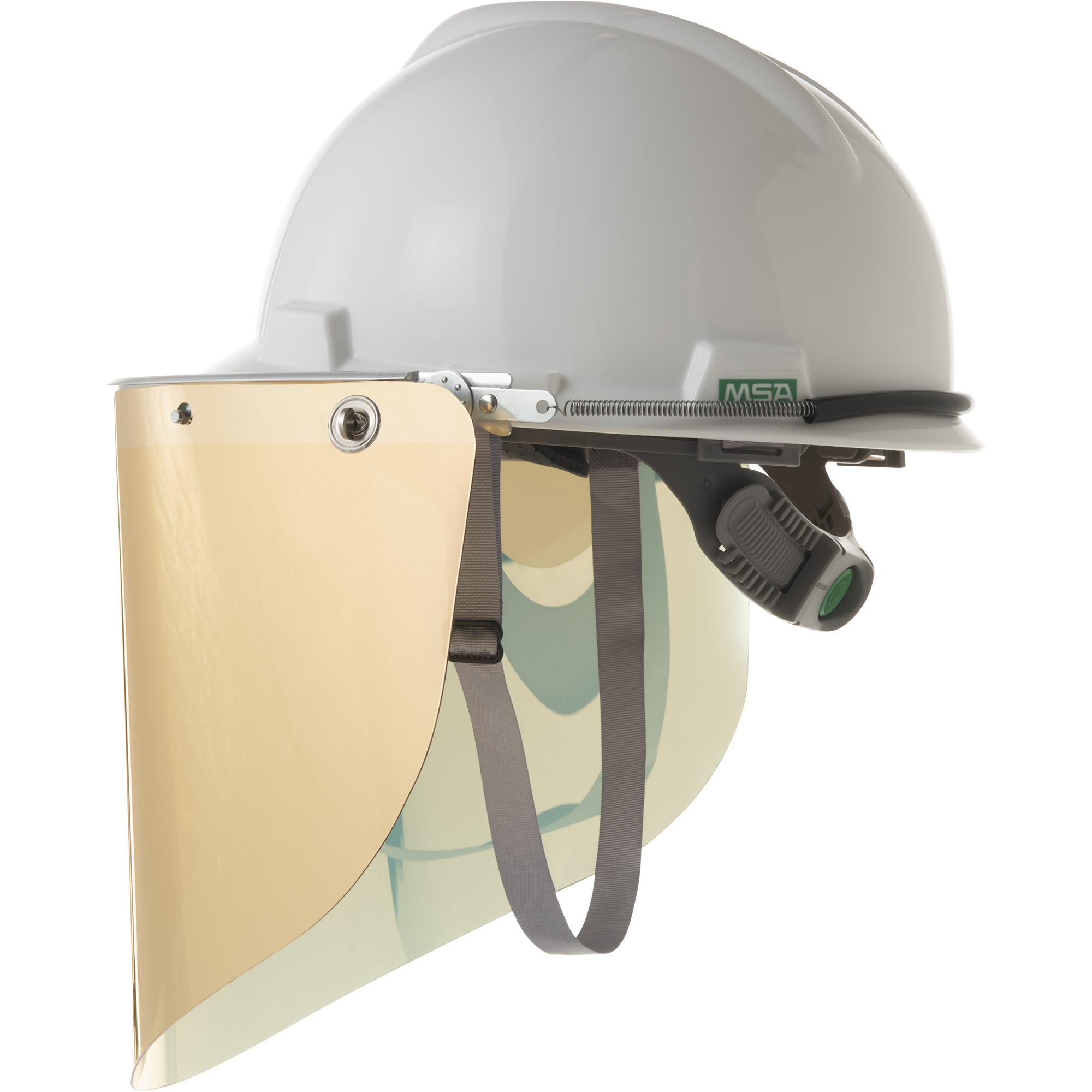 Protetor Facial incolor com película ouro, com sistema de sustentação composto de capacete de segurança para uso industrial. O protetor é composto de um visor confeccionado de policarbonato, com cerca de 225 mm de altura e 270 mm de largura, fixado a um suporte de alumínio em forma de arco dotado de canaleta que se encaixa na aba do capacete. O protetor facial é utilizado com o capacete de segurança Classe A, V-Gard, C.A 8.304, da MSA do Brasil Equipamentos e Instrumentos de Segurança LTDA.